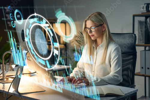 businesswoman, office, desk, computer, laptop, eyeglass, eyewear, digital display, holographic, hologram, fingerprint, biometric, projection, open, futuristic, innovation, invention, chart, infographic, technology, concentration, desk lamp, warm light, brightly lit, office chair, bookshelfSHARE