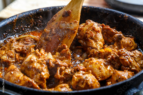 Greeting Cards: Chicken pieces stewed in sauce in spices in a deep frying pan with a wooden spatula.