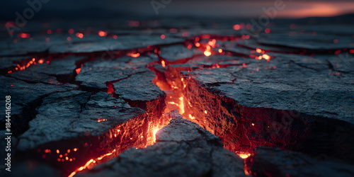 Greeting Cards: Dark volcanic rock surface texture with deep cracks emitting a brilliant molten red and orange glow from beneath. Image visualizes geological power, abstract energy, intense heat