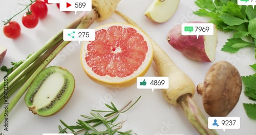 grapefruit, halved, static, badge, appearing, growing, social, buzz, engagement, tabletop, fruit, herb, overlay, vibrant, kiwi, parsnip, mushroom, rosemary, parsley, apple, white, studio, food, still life, centered, animated, drifting, overlapping, counter, like, heart, comment, follower, share, location, bell, play, electronic mail, message, clean
