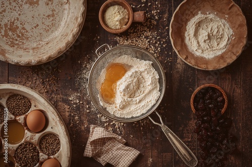 pie, poppy, seed, grape, wooden, brown, table, baking, ingredient, egg, flour, sieve