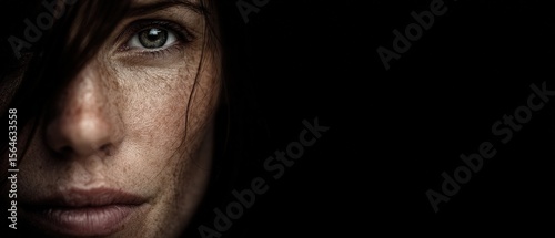 woman, freckle, green eye, portrait, closeup, white, emotion, beauty, face, intense, dark, background, eye, skin, detail, female, person, head shot, looking, 1, young, adult, human, model, natural, serious, expressive, dramatic, studio, shot, half, partial, view, artistic, moody, lighting, contrast, hair, strand, eyebrow, eyelash, nose, lip, mouth, texture, complexion, aesthetic, isolatedSHARE