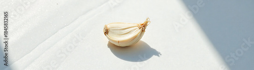 single, unpeeled, clove, garlic, sit, centered, crisp, surface, illuminated, soft, natural, light, casting, subtile, shadow