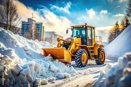 Pillows: A yellow bulldozer clears snow on a winter street, surrounded by towering snowdrifts and sloping piles, transforming the wintry landscape into a passable thoroughfare.