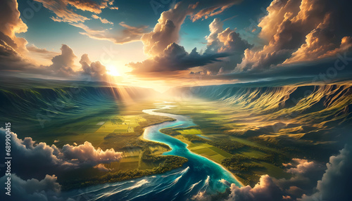 Pillows: Divine Dawn - Breathtaking Aerial View of a River Carving Through Verdant Valleys