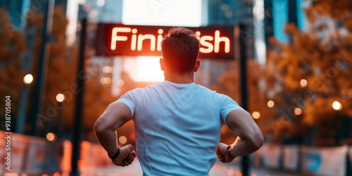 Pillows: Runner approaching the finish line in an outdoor city race, surrounded by vibrant autumn foliage and urban buildings.
