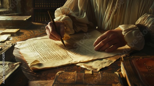 Shower Curtain: A person is writing a letter with a quill and inkwell.