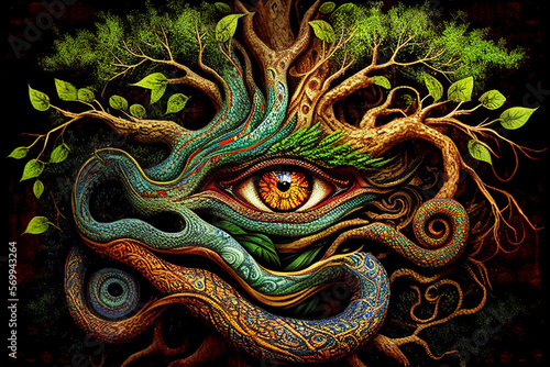 Shower Curtain: Ayahuasca compilation.Shamanic meditation. The journey of consciousness. A dragon in a tree trunk. The magic eye. Generative AI.