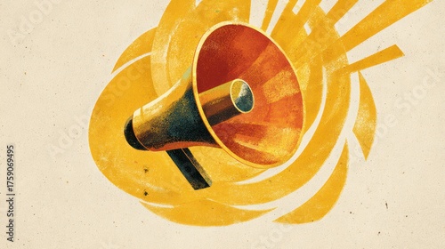 megaphone, communication, illustration, announcement, yellow, beige, sun, ray, broadcast, speak, voice, sound, listen, promote, advertise, message, noise, loud, speaker, public, rally, protest, politic, opinion, expression, freedom, art, design, graphic, vintage, retro, style, texture, grunge, paper, background, radial, beam, gold, ocher, yell, declare, news, urgency, attention, important, boldSHARE
