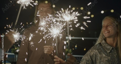 Newlyweds kissing among sparkles