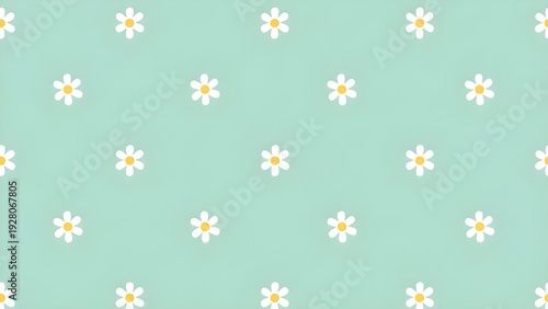 산뜻한 민트색 배경 위로 노란 수술을 가진 하얀 데이지 꽃들이 일정한 간격으로 배치된 귀엽고 깔끔한 플로럴 디자인 / Cute and clean floral design with white daisy flowers with yellow stamens arranged at regular intervals on a fresh mint background