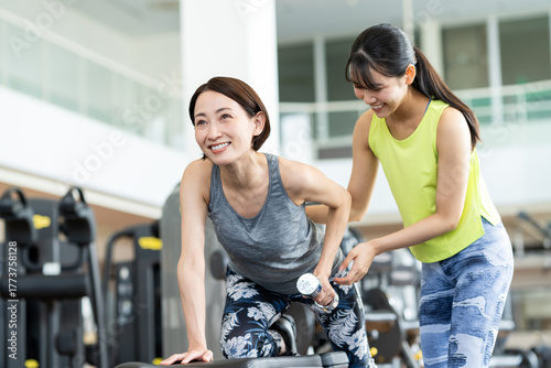 gym, fitness, exercise, cosmetic, woman, middle-aged, young, japanese, people, trainer, lifestyle, beauty, beauty, dumbbell, smile, speaking, conversation, training, training, exercise, diet, sport, health, sports club, indoor, pursuit, lively, instructor, working out, waist up, weight loss, train, two people, copy space, hear, raise