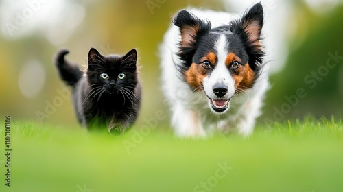 A black cat and a brown & white dog stroll in the grass with one eyeing the camera