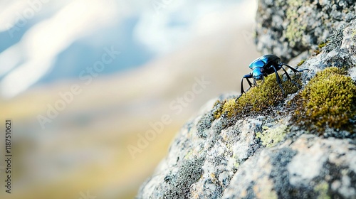 A blue bug perched on a rock adjacent to a green mossy plant on a mountain slope