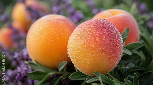 A cluster of oranges perched on a rain-drenched bush, surrounded by lush purple blossoms