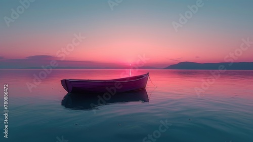 A pink-blue sky above a water body as the sun sets in the distance with a boat floating atop it