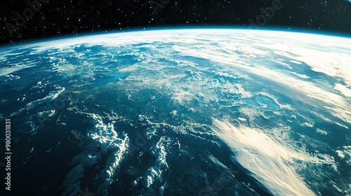 A stunning image of Earth viewed from outer space, with the sun illuminating the horizon and Earth in sharp focus in the foreground