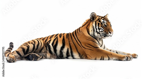 A tiger lying flat on the ground, with its front paws on its back, and head turned to the side