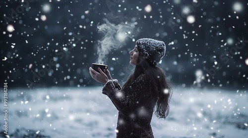 A woman in snowy weather, holding a coffee mug and gazing up at the falling snowflakes