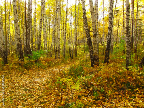 Autumn in the forest. Yellow red orange fallen leaves on a path in a birch forest. Scenic autumn landscape of a birch grove. The nature of Siberia. Russia.