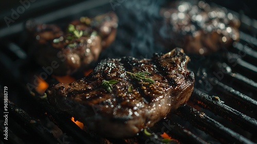 Cooking steaks on a grill with smoke emitting from the top