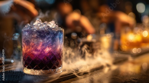 cocktail, drink, bar, night, fantasy, cosmos, alcohol, glasses, ice, colourful, pigmentation, purple, blue, red, universe, star, cool, vapour, counter, shimmer, science fiction, nightlife, closeup, liqueur