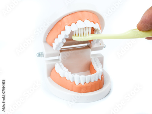 Plastic teeth models with Toothbrush how to clean teeth with brush properly and right, isolated on white background, concept Dental care and medical