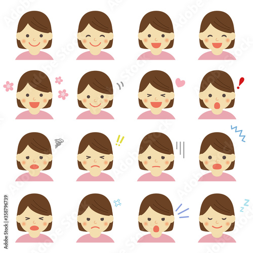 woman, expression, icon, illustration, sweet, vector, variation, smile, girl, woman, waist up, young, japanese, asian, people, character, homemaker, mother, mother, 30s, emotion, mood, feeling, smile, fun, happy, lively, happy, nod, rejoice, surprised, surprised, see, flash, cry, sad, painful, drop, malfunction, go to bed, resent, anger, cartoon, collection, set