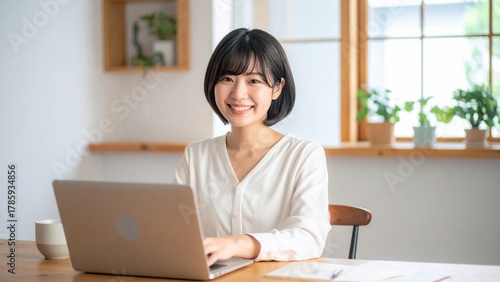 自宅でノートパソコンを使ってネットビジネスをする若い日本人女性 16:9サイズ