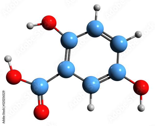 3D image of Gentisic acid skeletal formula - molecular chemical structure of dihydroxybenzoic acid isolated on white background