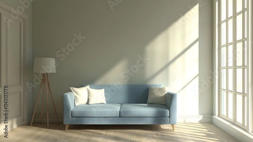 3D rendering of modern living room with blue sofa and empty mock up wall background