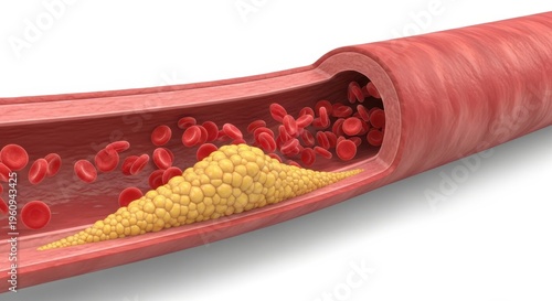 artery, cholesterol, plaque, blood, erythrocytes, blood flow, plugging, grease, deposit, medicine, medicative, anatomy, disease, health, heart attack, stroke, thrombosis, vein, danger, unhealthy, three-dimensional, illustration, cross section, rendering, graphic, biology, science, cell, red, yellow, macro, close-up view, isolated, concept, cardiology