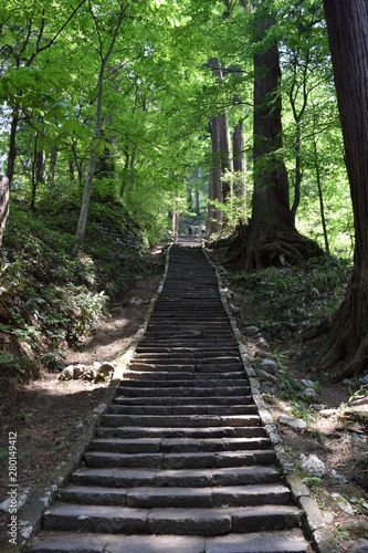 羽黒山の石段 /山形県鶴岡市の羽黒山は標高414mで、山岳信仰の中心地として有名です。参道は瑞心門から国宝の五重塔を通り、上ること2446段と、神社では石段の数で日本一です。出羽三山神社までは車での参拝も出来ますが、パワースポットの御利益は、徒歩の方が上と言わています。