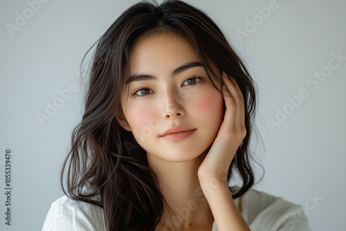 woman, japanese, 30s, cosmetic, skin, skincare, health, hand, beauty, beauty, black hair, long hair, smile