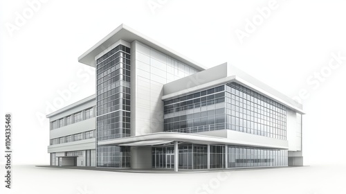 a 3D rendering of a modern office building on a white background The building has a sleek, modern design with a white facade and a large entrance The windows are