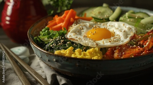 a bowl of spicy Korean bibimbap with assorted vegetables and a fried egg, accompanied by a red ceramic vase. The evening light enhances the vibrant, colorful presentation.