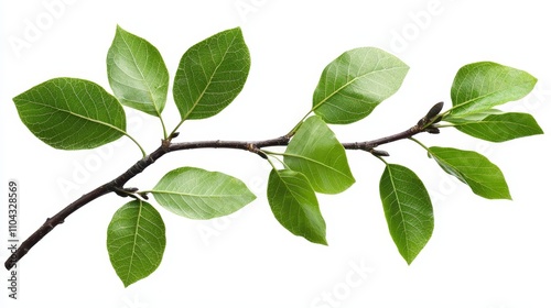 a branch of a tree with green leaves on a white background The leaves are a vibrant green color and the branch is a light brown color The background is a bright w