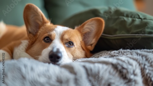 A brown-and-white dog lies on a bed, near a green pillow atop it