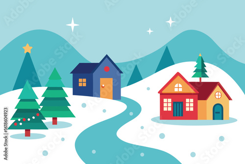 house, winter, christmas, tree, snow, landscape, scene, holiday, season, snowy, mountain, decoration, star, path, building, rural, cold, december, nature, countryside, village, celebration, pine, fir, ornament, roof, facades, exterior, artwork, drawing