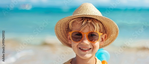 A child, up-close, dons a hat and sunglasses on a sandy beach Ocean and sky form an expansive backdrop behind