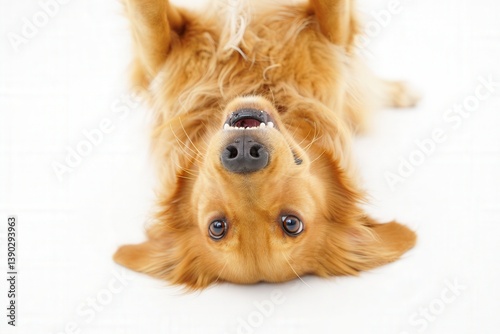 A golden retriever dog lying on its back with its belly exposed, looking up at the camera.