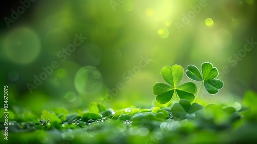 A group of four clover leaves sits atop a lush, sun-kissed green field Sunlight filters through the clovers' leaves in the foreground