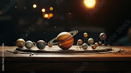 a group of planets sitting on top of a wooden table in front of a dark background with the sun in the distance. generative ai