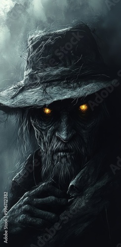 A man in a hat with yellow eyes stands in a foggy scene, surrounded by dense fog The backdrop is dominated by a foggy, indistinct sky
