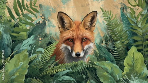 a painting of a fox peeking out from the leaves of a ferny forest, with a yellow wall in the background and a painting of a red fox in the foreground.