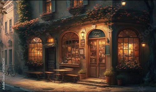a painting of a restaurant with a bicycle parked outside of it. generative ai