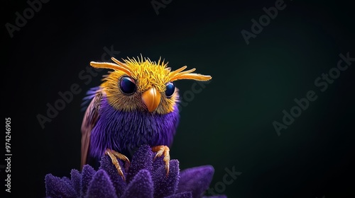 A purple flower with a yellow and black-headed bird perched closely, against a solid black backdrop