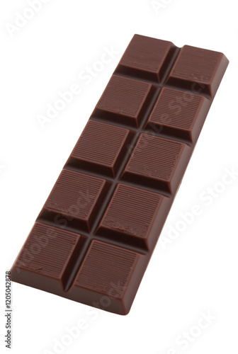 a rectangular bar of dark chocolate, showcasing its smooth surface and rich, deep brown color.