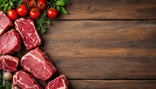 A rustic wooden surface displays six raw beef steaks, accompanied by cherry tomatoes and fresh herbs, creating a visually appealing and appetizing arrangement.