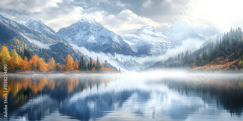 a serene landscape of a mountain lake with fog and mountains in the background. The lake is surrounded by trees and hills.